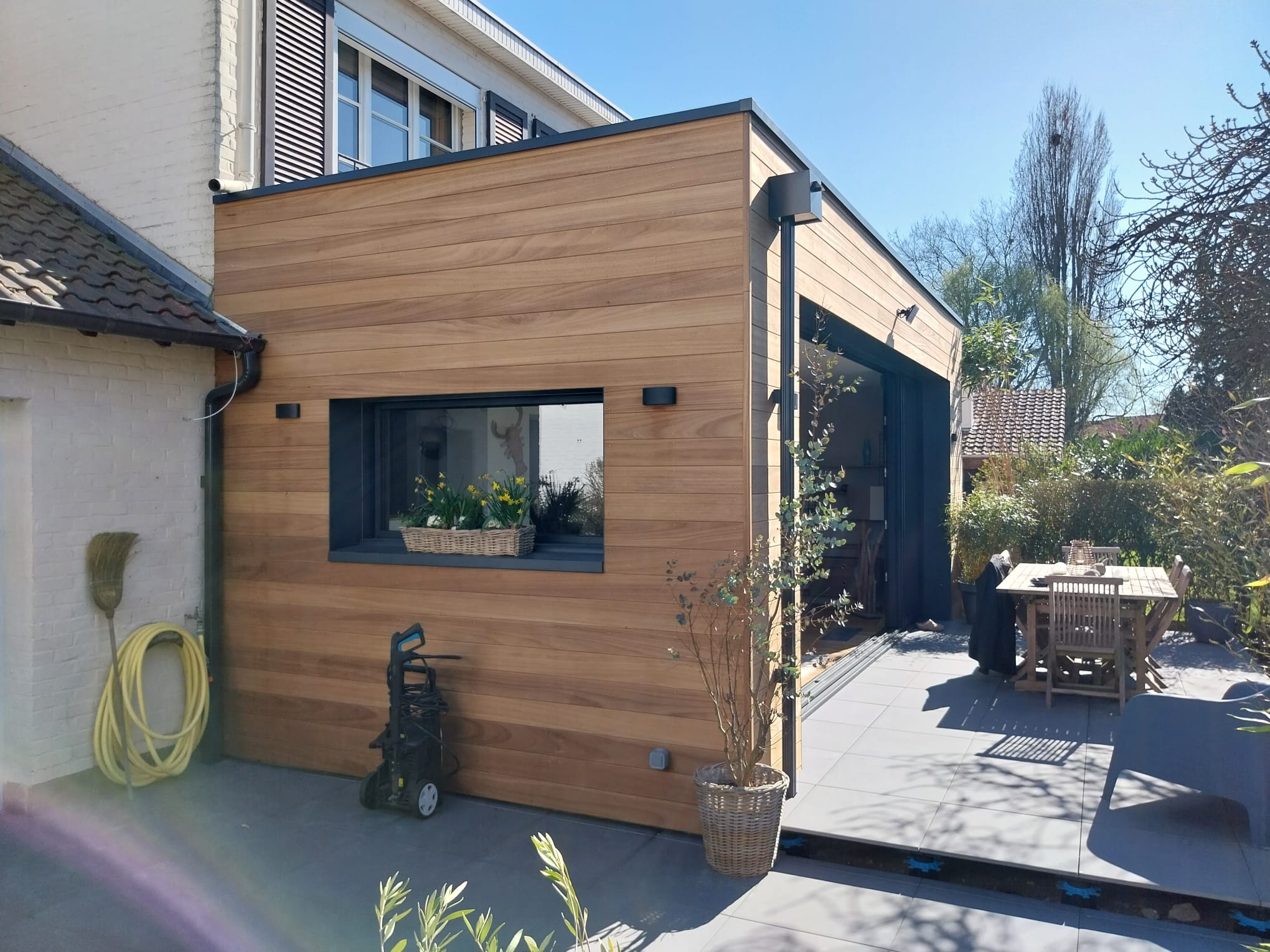 L'agrandissement, d'environ 25 m², adopte une toiture plate et des lignes épurées. Sa conception associe rigueur structurelle et performance thermique.