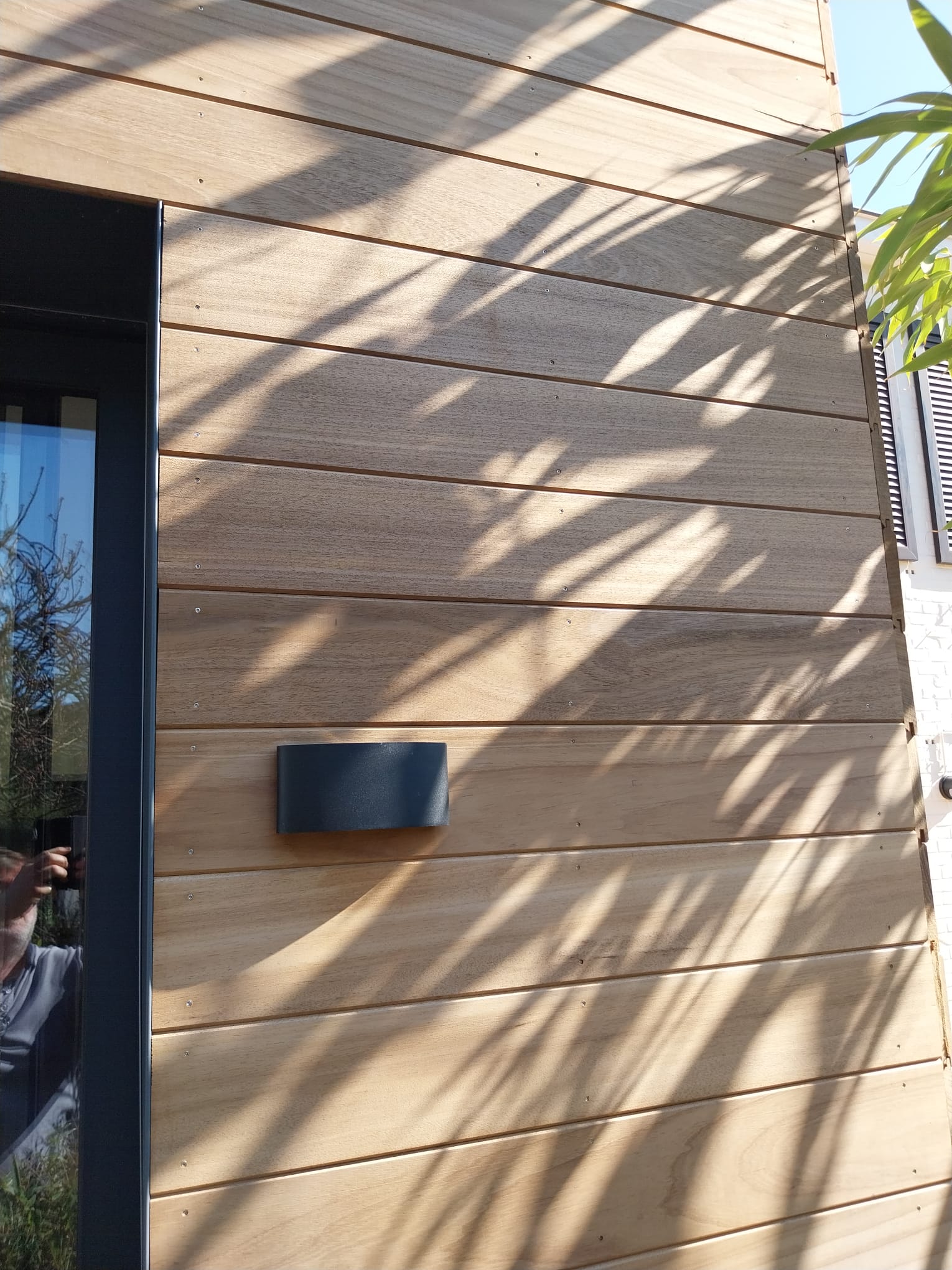 Le bardage en ayous naturel thermo chauffé confère au projet chaleur et modernité. Son rythme horizontal contraste subtilement avec la brique peinte existante, créant un dialogue équilibré entre tradition et contemporain.